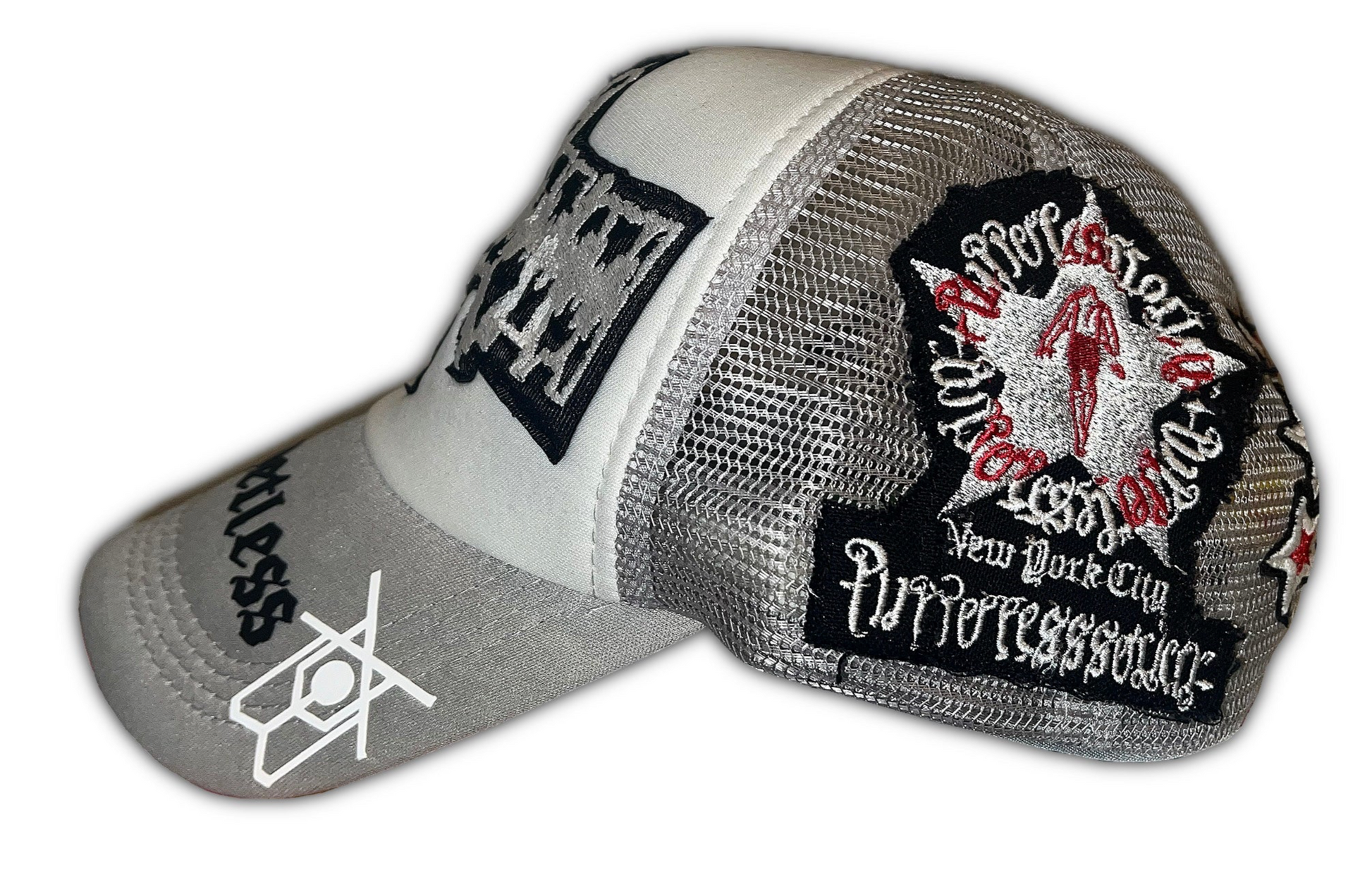 One of One Trucker Hat - Embroidered patches sewn onto the hat feature iconic Puppetless imagery. The hat also includes the iconic Puppetless bridge and a subtle outline of the branding logo. On the side panel, the phrase "Puppetless Society" is outlined, symbolizing the brand's iconicity and recognizable presence. The brim also features the raised 3D vinyl logo for added impact.